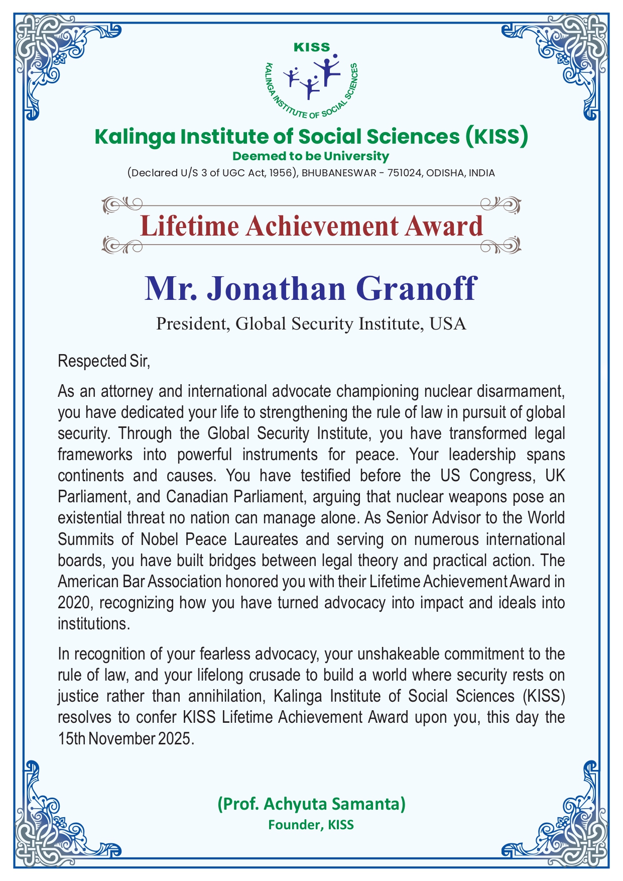 Mr Granoff’s lifelong commitment to creating a safer and more compassionate world reflects values that resonate with the vision of KISS — a world where every individual, especially children and young people, can grow with dignity, opportunity and peace.
